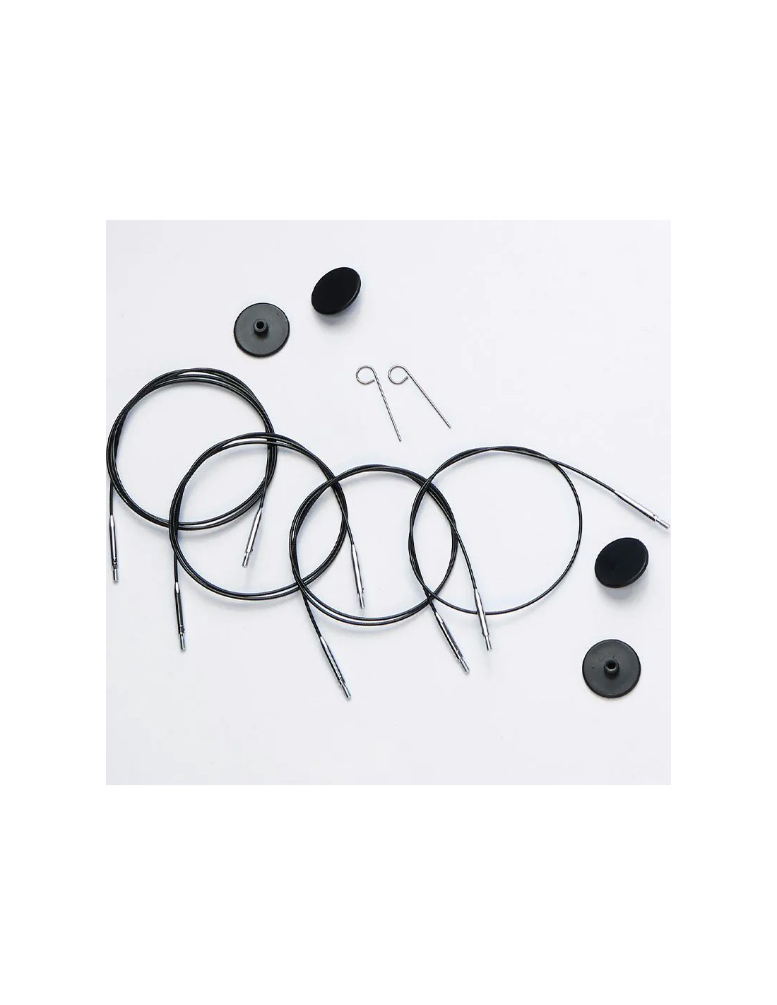 Die leichtgängigen Edelstahl-Drehkabel von KnitPro sind um 360 Grad drehbar und verhindern so ein Verdrehen. Die formstabilen Kabel bestehen aus hochwertigem Edelstahlkern und sind mit einer glatten Nylonummantelung in zwei attraktiven Farben erhältlich: Schwarz und Lila. Die Kabel sind in Längen von 20 cm bis 126 cm verfügbar und werden inklusive Endkappen und Kabelschlüsseln zum Festziehen der Spitzen geliefert.