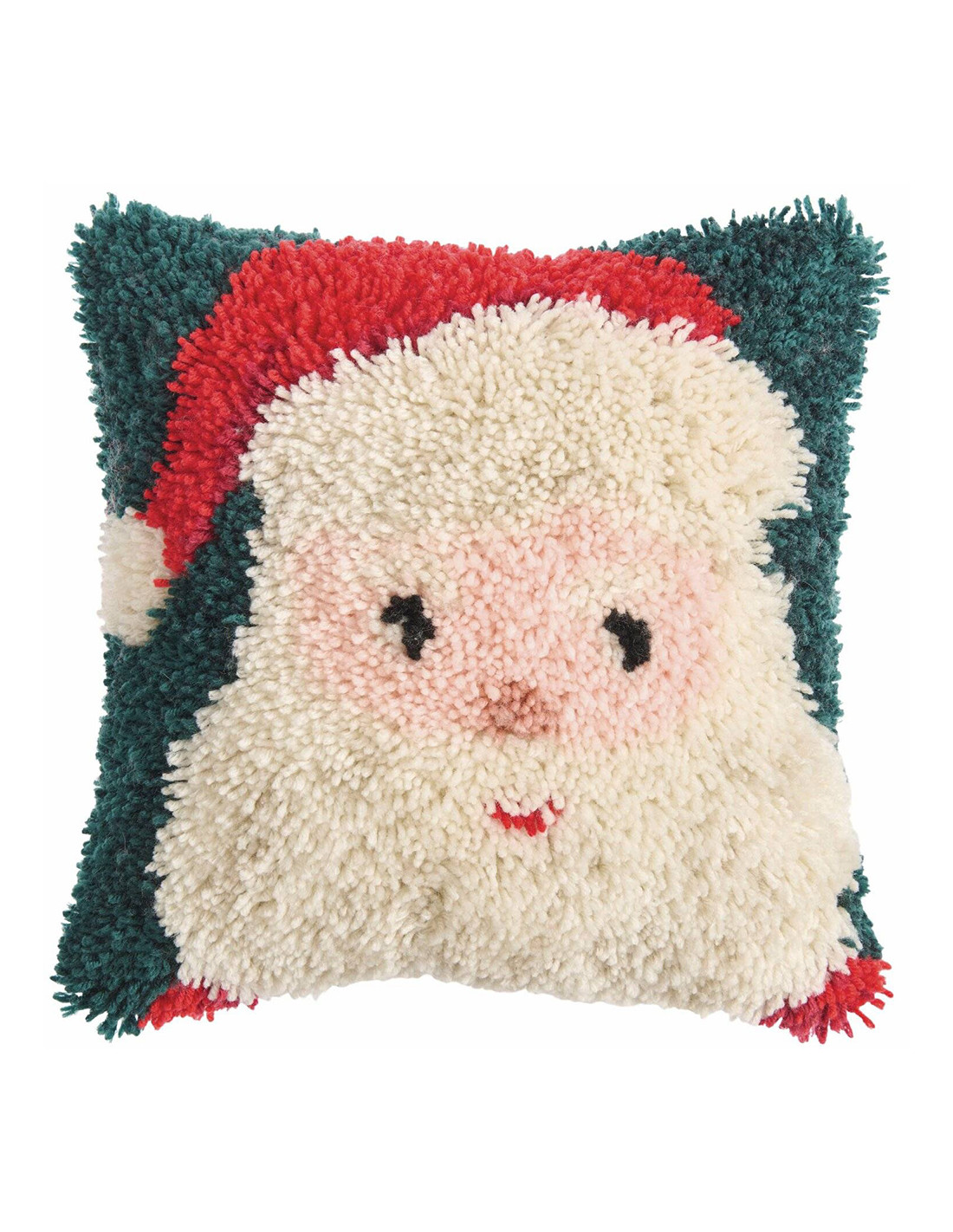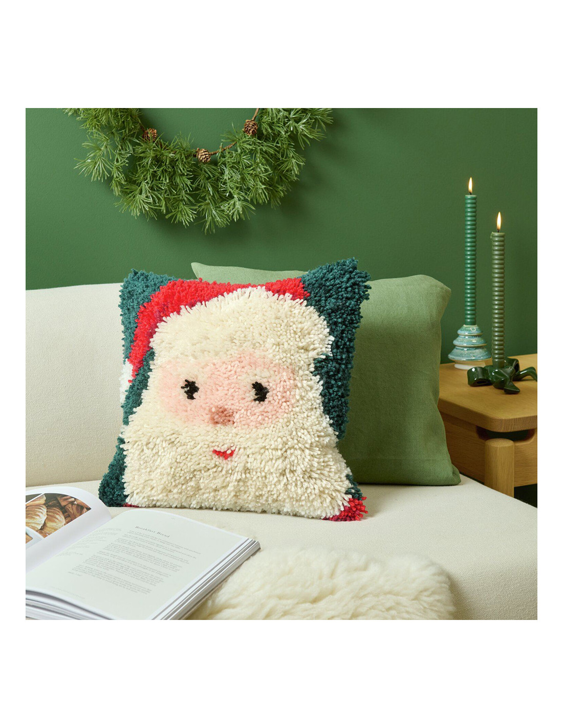 Das Rico Hooki Hooki Knüpfset Santa Kissen enthält Stramin mit dem vorgezeichneten Santa-Portraits. Das Set umfasst außerdem zugeschnittenes Knüpfgarn, den Knüpfhaken, Tape, die Kissenrückplatte und eine ausführliche Anleitung. Das dekorative Kissen erhält fertige Maße von 40x40cm.