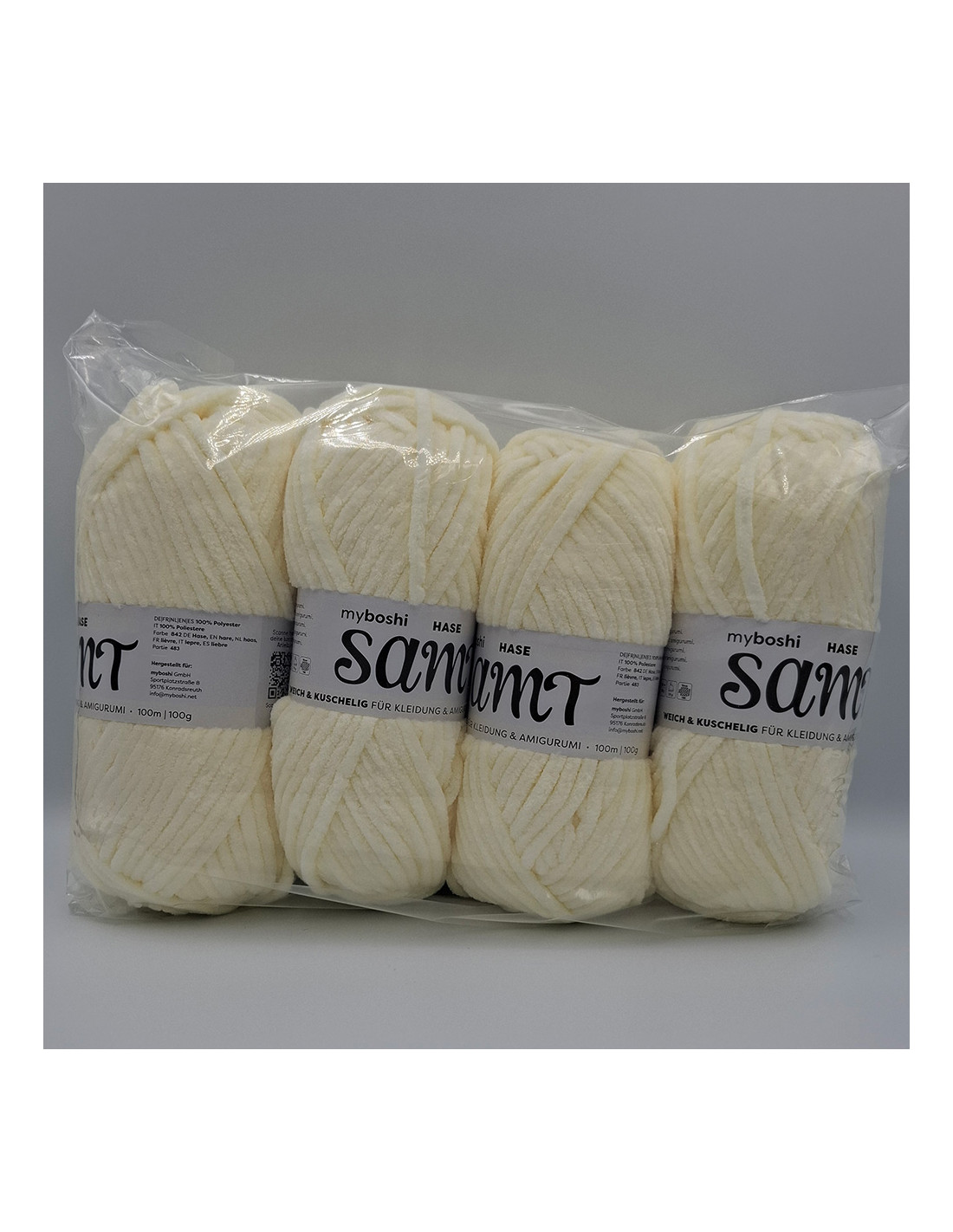 Die Wolle besteht zu 100% aus Polyester und kommt in großen 100g Knäueln mit 100m Lauflänge daher. Zum Verarbeiten empfehlen wir eine Nadelstärke von 4 - 7.