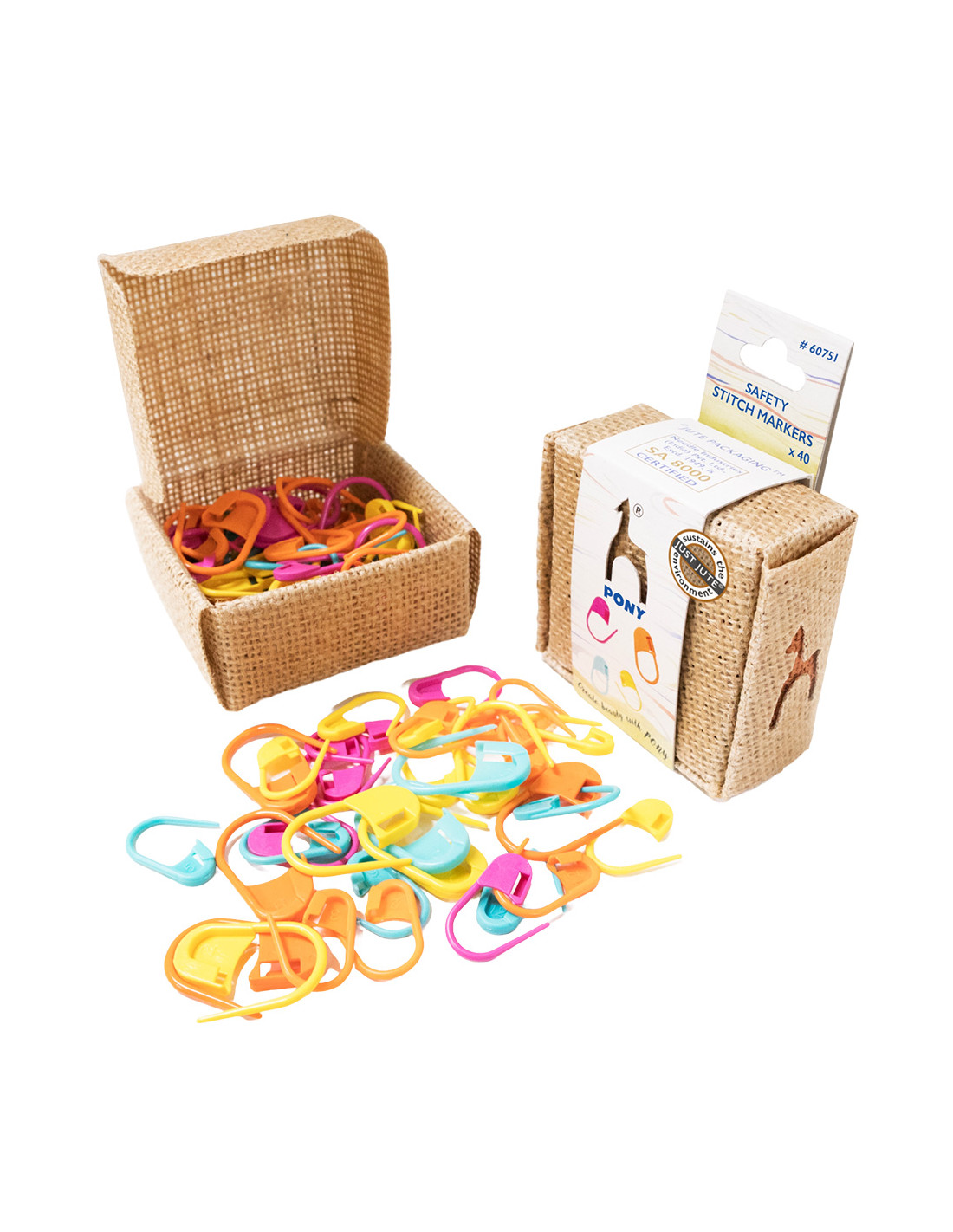 Die JUST JUTE© Box von PONY bietet Stricker*innen eine praktische Sammlung von farbenfrohen Maschenmarkierern. Diese Miniatur-Sicherheitsnadeln aus Kunststoff lassen sich einfach und sicher auf der Masche verschließen, um Abnahmen, Zunahmen oder Farbwechsel zu markieren. Sie passen auf Nadeln bis Stärke 10 und sind leicht zu entfernen, wenn sie nicht mehr benötigt werden. Die Box enthält 15 große und 25 kleine Marker in ansprechenden Farben – ideal für eine übersichtliche Aufbewahrung und den schnellen Zugriff während des Strickens.